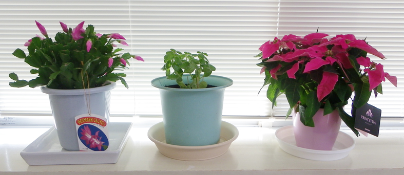下:食堂の花たち。左から「デンマークカクタス」「ミント」「プリンセチア」