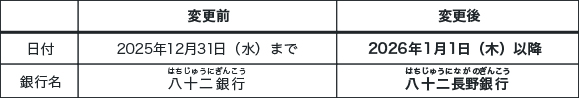 この度、当方の取引銀行である八十二銀行が、2026年1月1日(木)に予定している長野銀行との合併に伴い、「銀行名」が「八十二長野銀行」に変更となります。